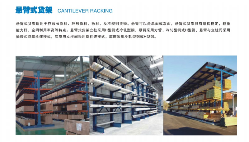 1、悬臂式货架有单臂和双臂之分,高效存储木料、管材、长条物等类似产品。悬臂式货架可由单个立柱片单元配以悬臂通过水平拉杆、斜拉杆等连续组成多个单元系统。
