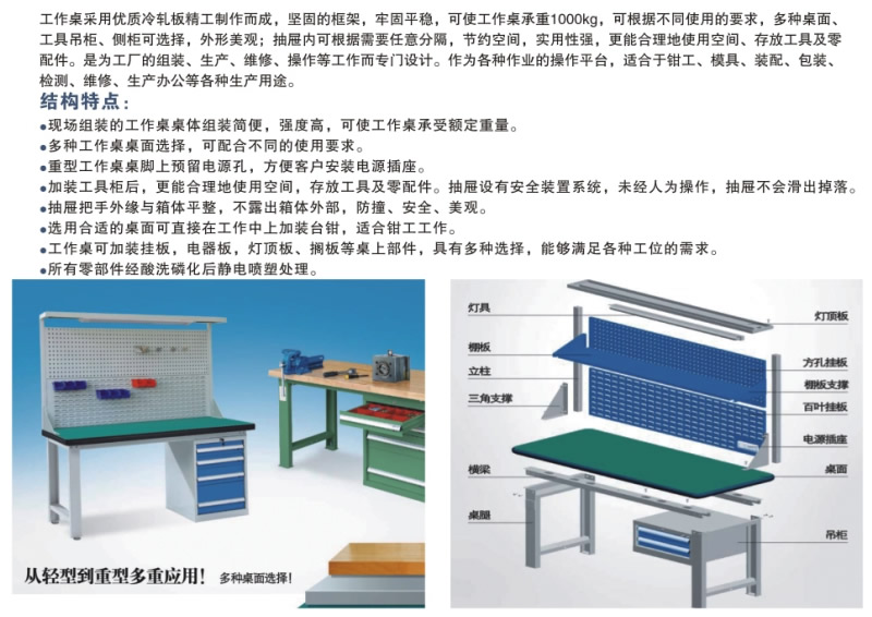 1、现场组装的工作桌桌体组装简便,强度高,可使工作桌承受额定重量。2、多种工作桌桌面选择,可配合不同的使用要求。3、重型工作桌桌脚上预留电源孔,方便客户安装电源插座。4、加装工具柜后,更能合理地使用空间,存放工具及零配件。5、选用合适的桌面可直接在工作桌上加装台钳,适合钳工工作。6、工作桌可加装挂板,电器板,灯顶板、搁板等桌上部件,具有多种选择,能够满足各种工位的需求。